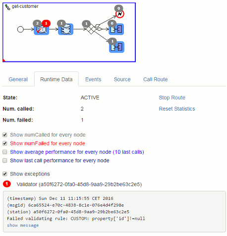 For every route you see what are the route nodes, how they are linked to each other, what every route node is doing. You can see performance statistic per route node. So you see where exactly within a route an error was thrown, what that particular route node is doing, what was an error, when it was thrown, and what was the message that led to an error
