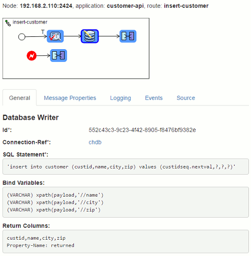For example, click on "Database Writer" to see SQL statement, bind variables, return columns (if there are any) and other properties