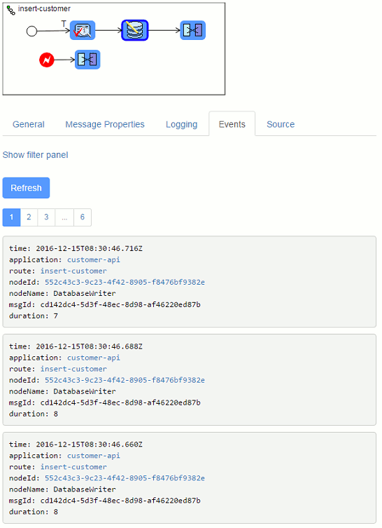 Every runtime event contains information on timestamp, message id, application, route, route node and duration (in milliseconds). In case of error, whole exception stack trace is shown here
