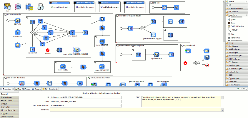 Build complex processes with no programming experience. With Flink-ESB Editor you rarely needs to code something. All you need to to is just drag and drop the componenets you require onto editor canvas and set their properties. Start the application with just one click in the editor and test it by calling process in test view of the editor or in the Flink-ESB Admin Console
