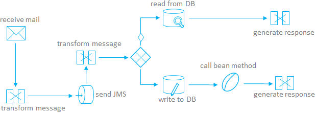 Every route consists of "Route Nodes", that are "Linked" with their neighbours. Every route node is responsible for some simple activity within the route: convert the message, split the message into array of smaller messages, decide where to send the message next (based on content of the message), send HTTP request to remote server, execute SQL statement etc. Links are responsible for passing message to the next route node, sometimes they also convert the message payload to some other format