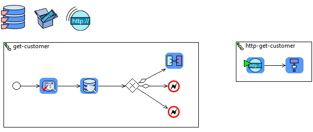 You should have a DB connection pool, HTTP server, HTTP connector and two routes with names "get-customer" and "http-get-customer".