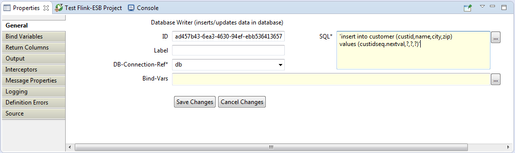 Click "Save Changes". Select "Data writer" and enter its properties as below: "DB-Connection-Ref" : db, "SQL" : 'insert into customer (custid,name,city,zip) values (custidseq.nextval,?,?,?)':