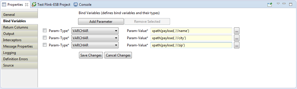 Click "Save Changes", then click "Bind Variables" tab, press "Add Parameter" button and enter data: "Param-Type" : VARCHAR, "Param-Value" : xpath(payload,'//name').