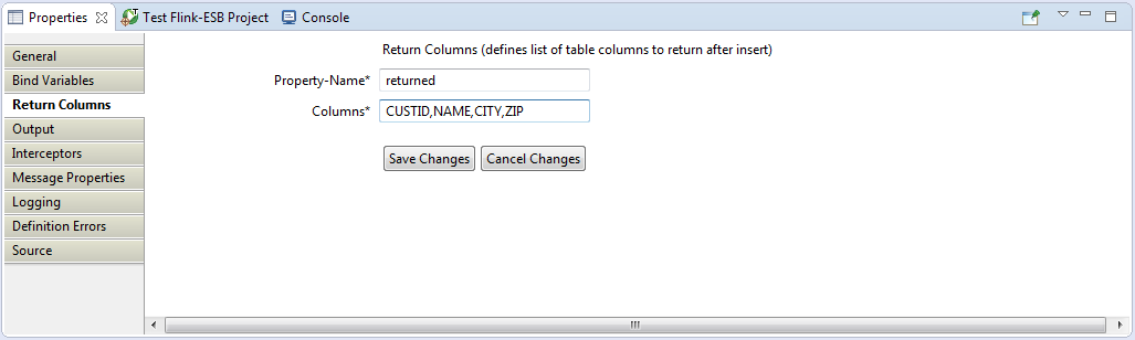 Click "Save Changes", then click on "Return Columns" tab and enter data as below: "Property-Name" : returned, "Columns" : CUSTID,NAME,CITY,ZIP: