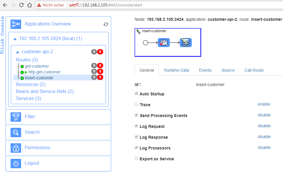 When the project is started, go to url https://localhost:8443/console/start in the browser. Login to Flink-ESB Admin Console with default username/password: admin/admin. Click on "Application Overview" to expand it, then click on triangle on the left side of instance name. Now you should see an application with name "customer-api". Click on the small triangle to expand components of the project. Click on "Routes" to expand it. Now you should see a route with name "insert-customer". Click on it to see its details on the right side of Admin Console: