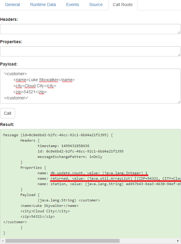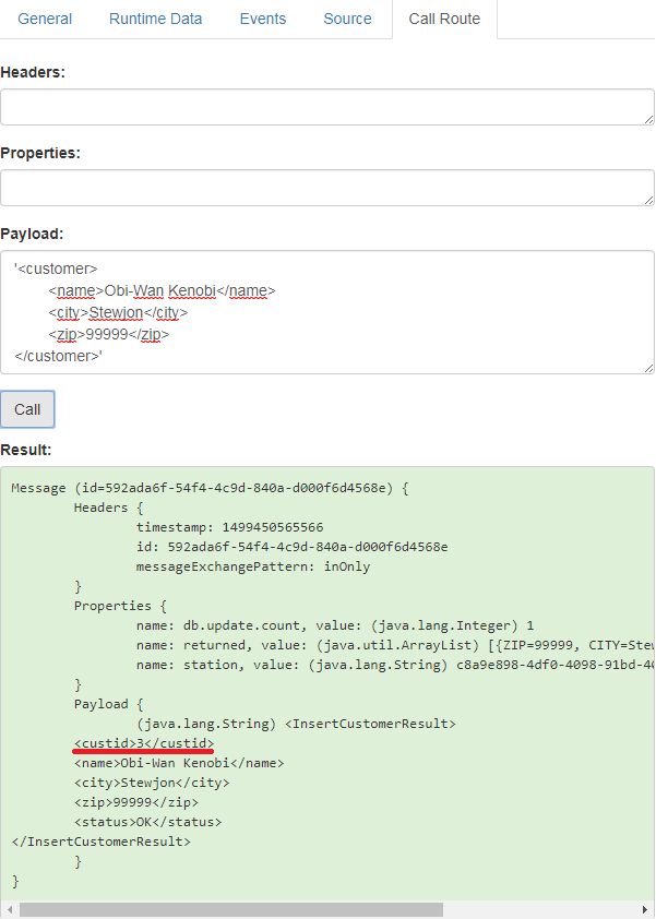 Click "Call Route" tab. Paste following message into "Payload" textbox: