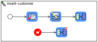 Go to Flink-ESB Editor and add "Catch Exception" component from "ESB General palette, and "Transformer" from "Mediation" palette to "insert-customer" route. Place them both below all other components. Create a connection link from "Catch Exception" to "Mediation" as on picture below: