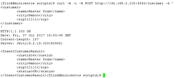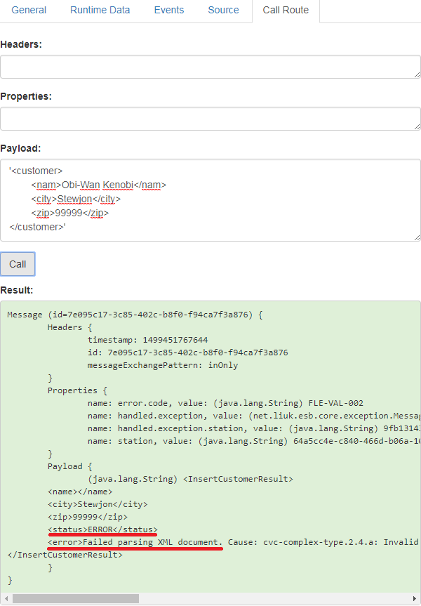 Go to Flink-ESB Admin Console, select "insert-customer" route, click "Call Route" tab, and paste following into "Payload" textbox: