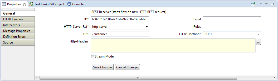 Select "REST Receiver" and enter its properties as on picture below: "HTTP-Server-Ref" : http-server, "Url" : /customer, "HTTP-Method" : POST: