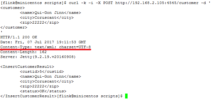 Go to Flink-ESB Editor and select "REST Receiver" within "http-insert-customer" route. Click "HTTP Headers" tab in properties window, and press "Add Header" button. Enter data as on the picture below: "Header-Name" : Content-Type, "Header-Value" : 'text/xml; charset=UTF-8':
