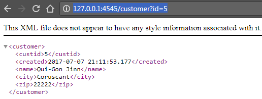 Go ahead and try with the browser http://127.0.0.1:4545/customer?id=5. You should get a response like on picture below: