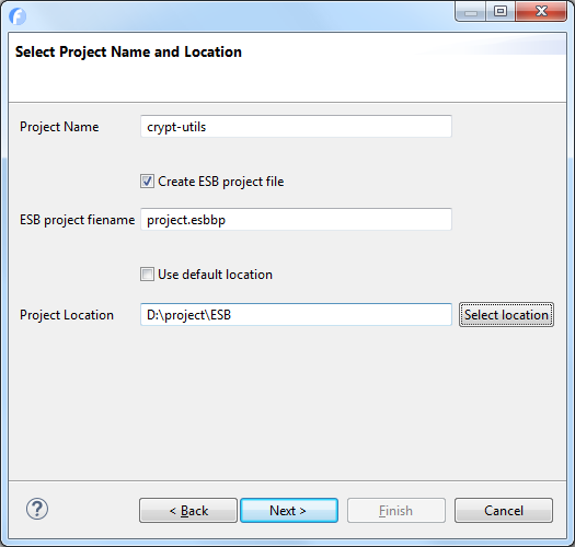 This opens a "New Flink-ESB Project" wizard. Enter data as on picture below: "Project Name" : crypt-utils, unselect "Use default location" checkbox and select a folder where a project should be created: