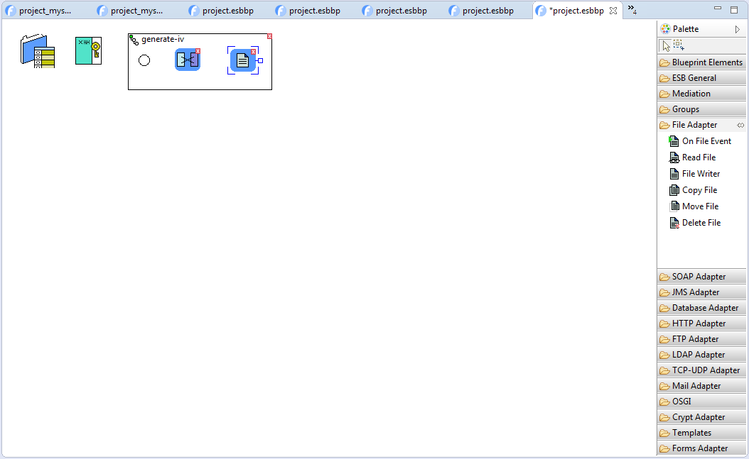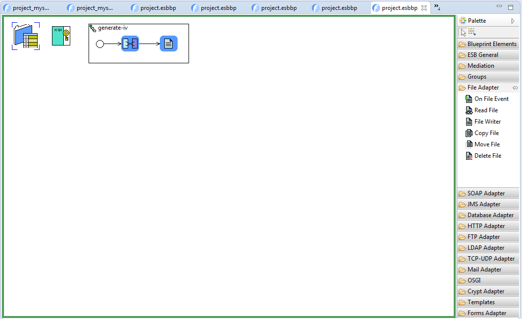 Now place following components onto "Splitter Group": 1) three "Transformers" from "Mediation" palette; 2) "Symmetric Decrypt" from "Crypt Adapter" palette; 3) "Catch Exception" from "ESB General" palette.