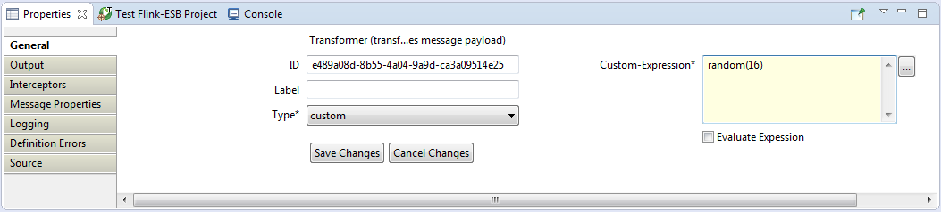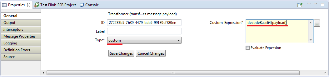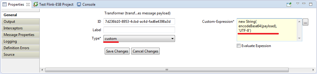 Click "Save Changes". Select "Transformer" connected to "Catch Exception" component and enter its properties as on picture below:
