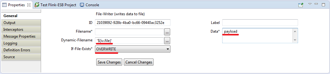 Click "Save Changes". Now select "File Writer" within the route and enter its properties as on picture below: