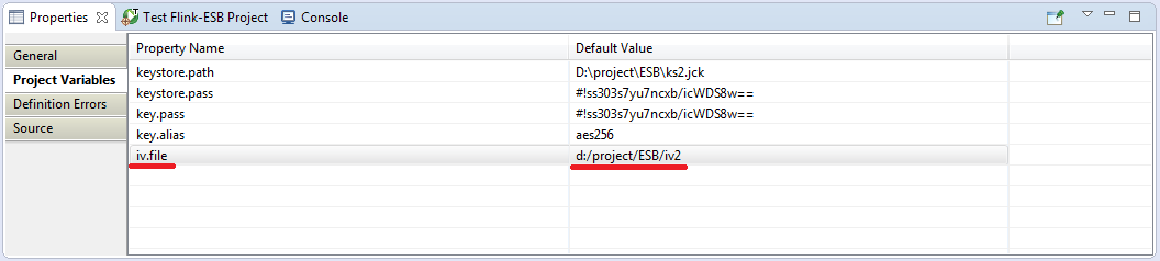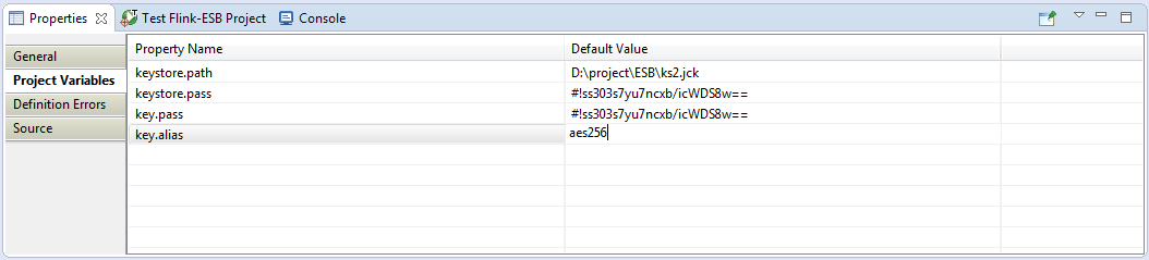 Click on "property.name" string to make it editable, and change its value to keystore.path. Now click on "property.value" string and change its value to D:\project\ESB\ks2.jck (adjust it accordingly if needed).