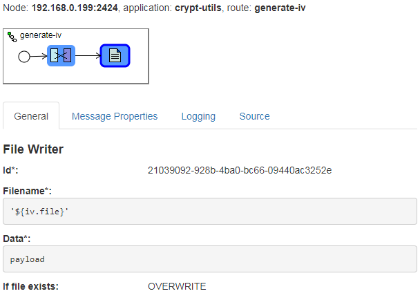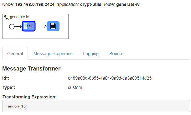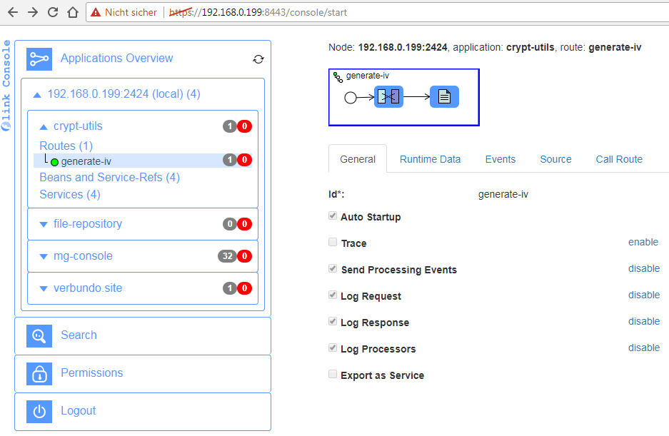 Click on "Application Overview" to expand it, then click on triangle on the left side of instance name. Now you should see an application with name "crypt-utils". Click on the small triangle to expand components of the project. Click on "Routes" to expand it. Now you should see a route with name "generate-iv". Click on it to see its details on the right side of Admin Console: