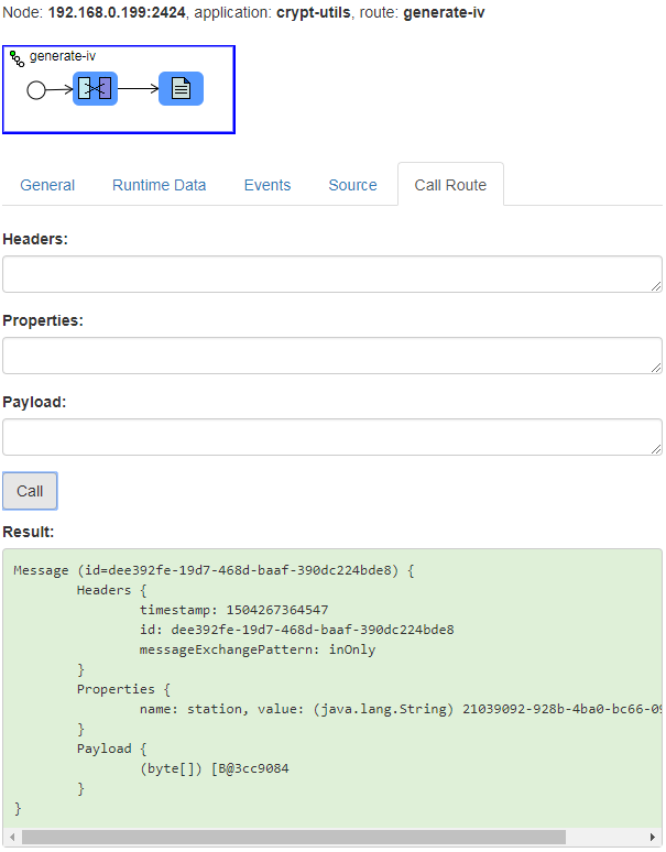 Login to Flink-ESB Admin Console, locate "encrypt-xml" route, select its "Call Route" tab.