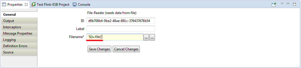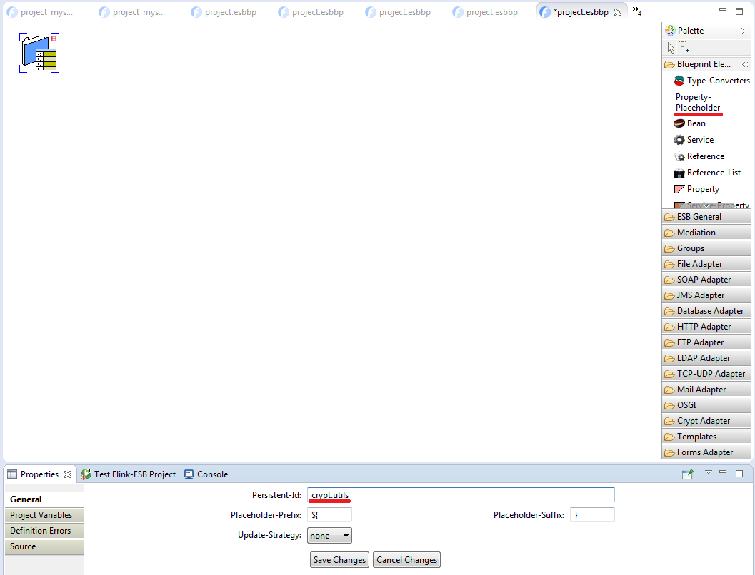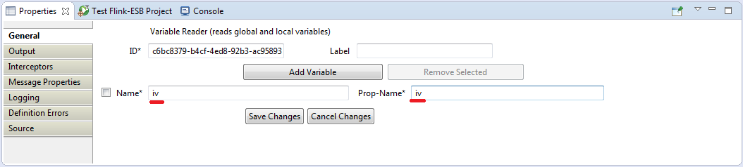 Click "Save Changes". As you can see, we define "Dynamic-Filename" property as project variable iv.file to make it configurable. So let's add this project variable to the "Properties-Placeholder" component. Select it, click on "Project Variables" tab in the properties window. Now add a new variable with name "iv.file" and value d:/project/ESB/iv2 (adjust the path if needed):