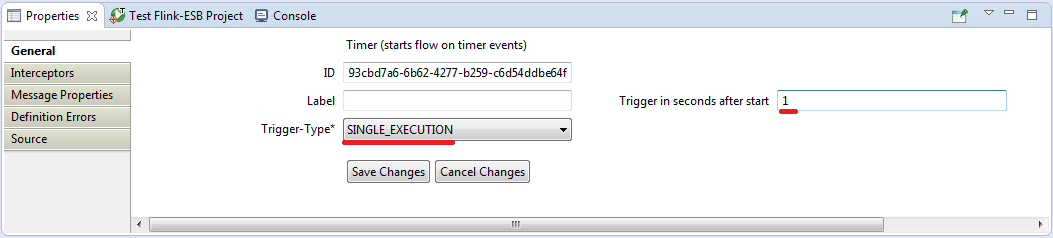 Timer with "Trigger-Type" SINGLE_EXECUTION starts its route execution only one time after application was started. When exactly is defined by the second property. In our case this route is started 1 second after application is started.