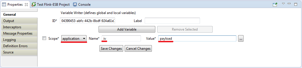Click "Save Changes". Select "Variable Writer" within the route, click on "Add Variable" button in properties window and enter data as on picture below: