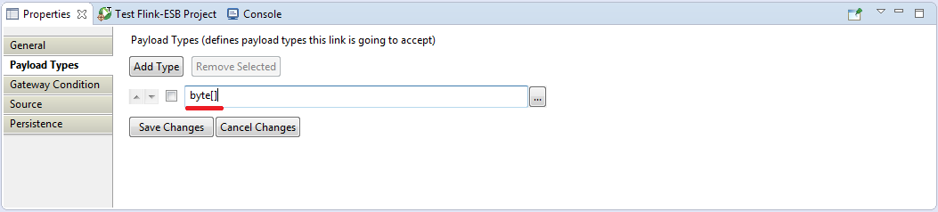 Click "Save Changes". Now select a connection link between "File Reader" and "Variable Writer". Click on "Payload Types" tab in the properties window. Enter data as on picture below: