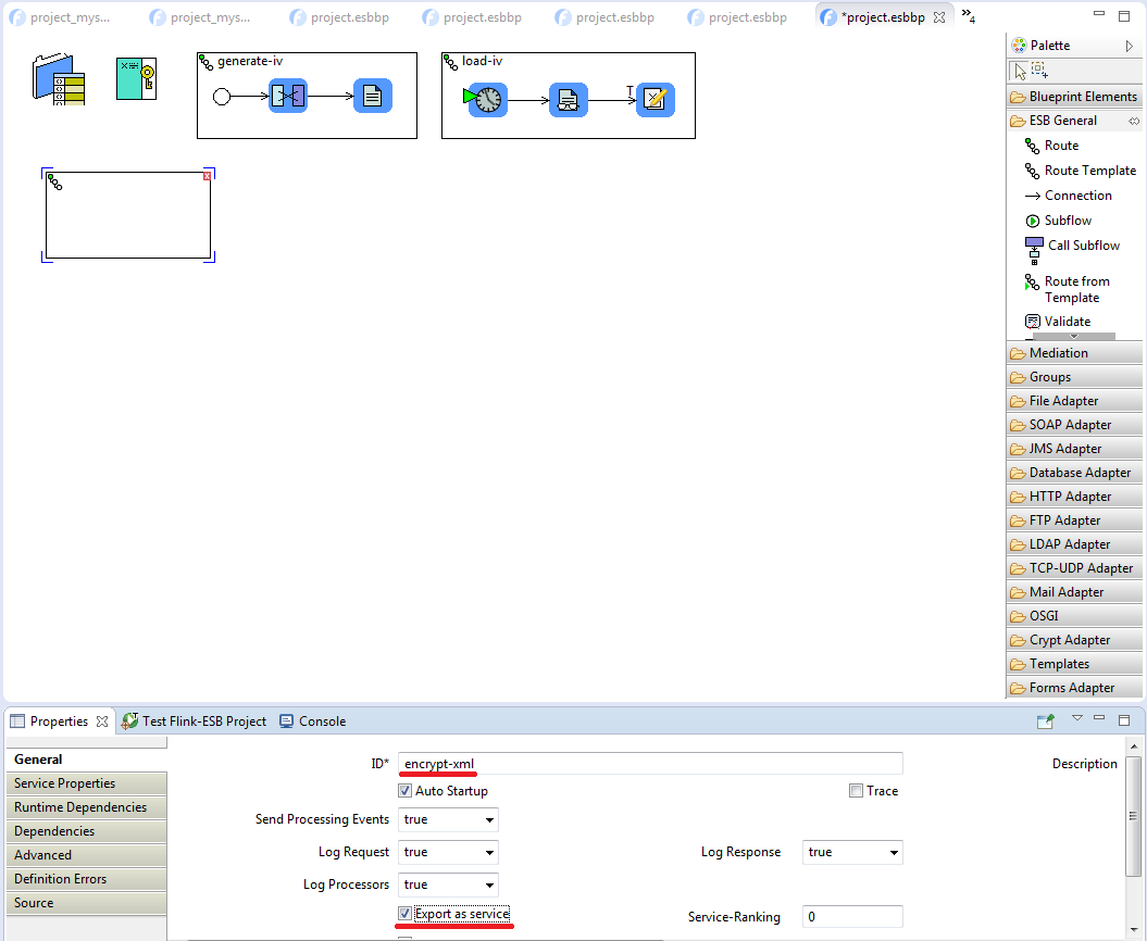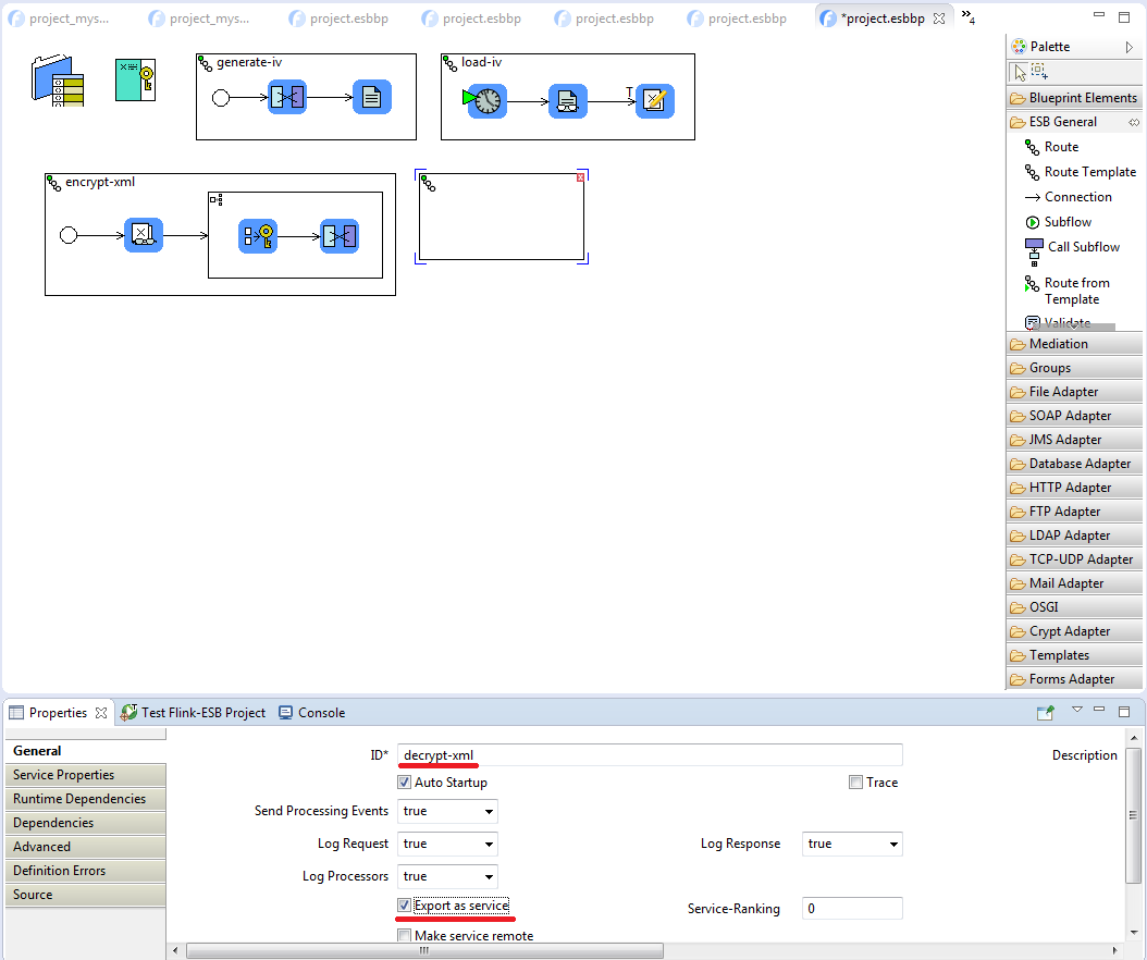 Add a new route to the project in Flink-ESB Editor. Enter its "ID" property as decrypt-xml. Activate "Export as service" checkbox:
