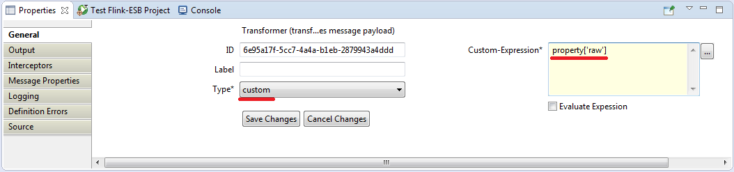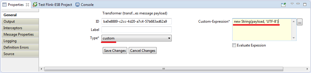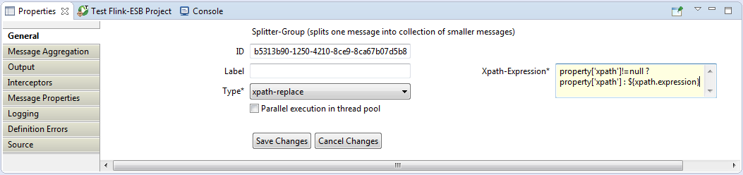 Click "Save Changes". Now select "Transformer" component within "Splitter Group" and enter its properties as on picture below: