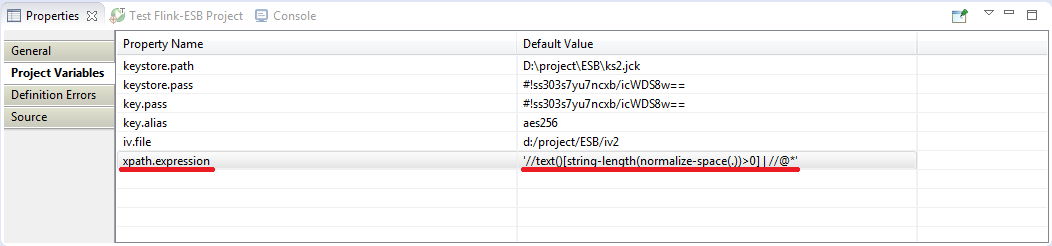 Now let us add a new project variable xpath.expression, used by "Splitter Group". Select "Property-Placeholder" component, click on "Project Variables" tab in the properties window. Now add a new variable with name "xpath.expression" and value '//text()[string-length(normalize-space(.))>0] | //@*':