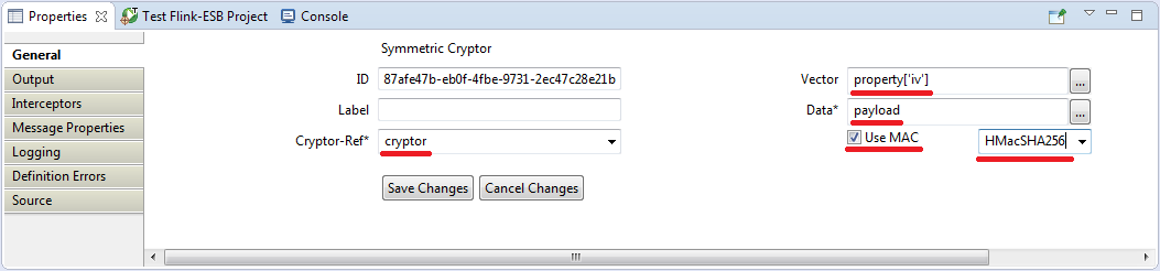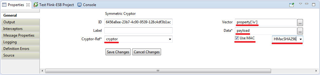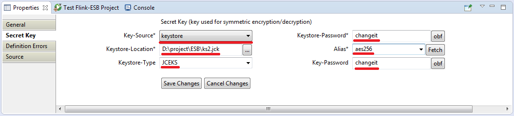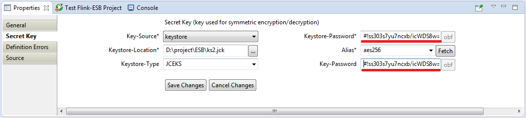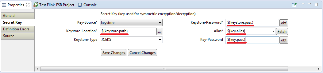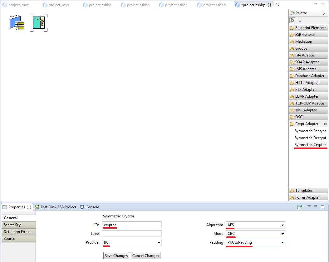 Now select "Symmetric Cryptor" component within Flink-ESB Editor and click on "Secret Key" tab in the properties window. Change properties as on picture below:
