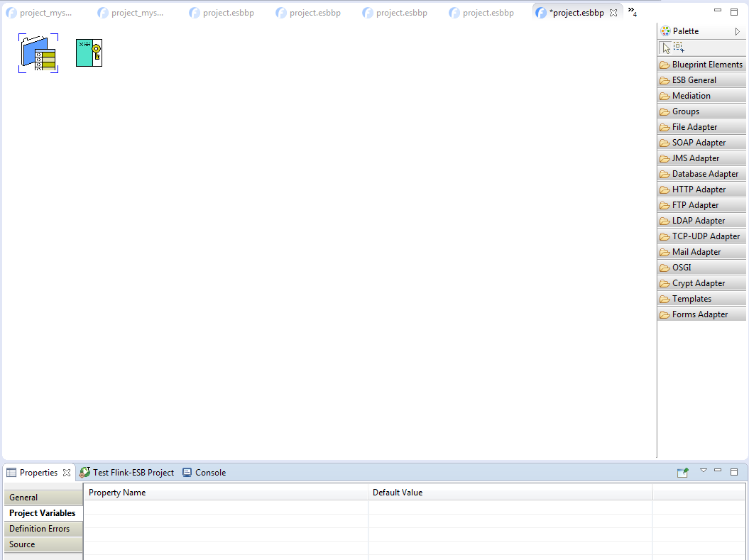 To do that click on "Property-Placeholder" component within Flink-ESB Editor, select "Project Variables" tab in the properties window. You should see an empty table: