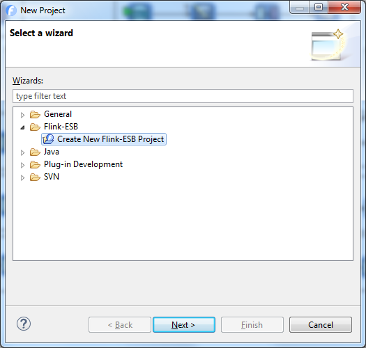 Open Flink-ESB Editor and select "File -> New -> Project" in the main menu. Double click "Flink-ESB" folder to expand it, select "Create New Flink-ESB Project" and press "Next"