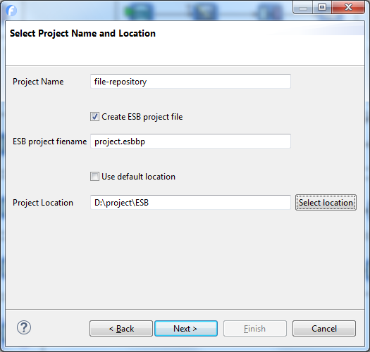 This opens a "New Flink-ESB Project" wizard. Enter data as on picture below: "Project Name" : file-repository, unselect "Use default location" checkbox and select a folder where a project should be created: