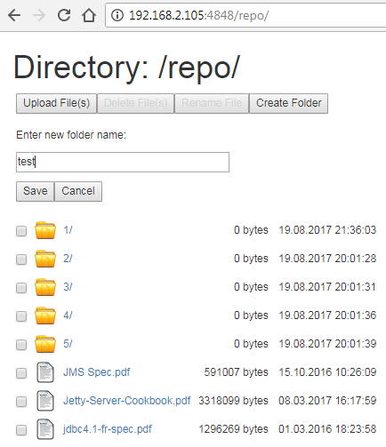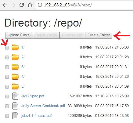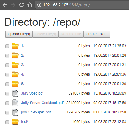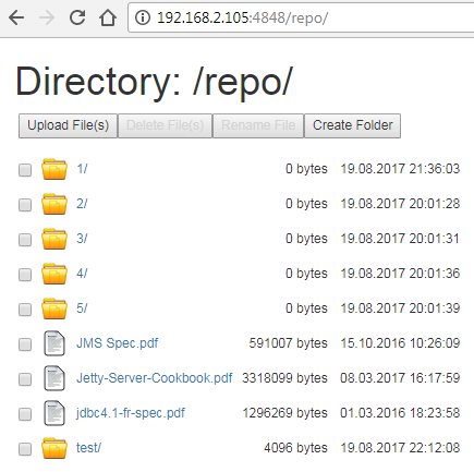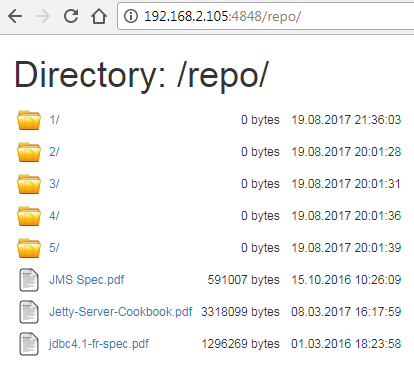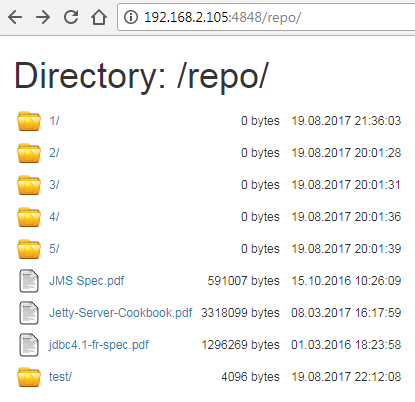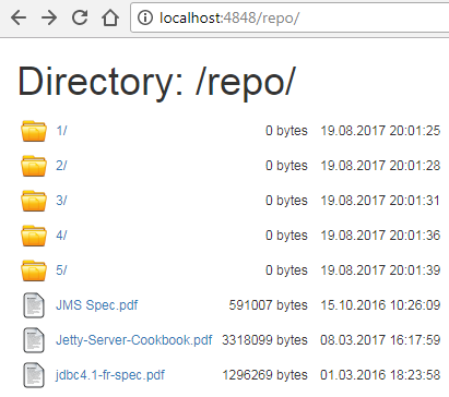 Now let's copy several files into folder d:\repository and refresh http://localhost:4848/repo in the browser. You should see now the files you've just copied to the folder: