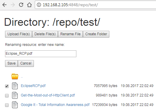 Compare this picture with the previous one. With admin user you can view and modify the content of file repository.
