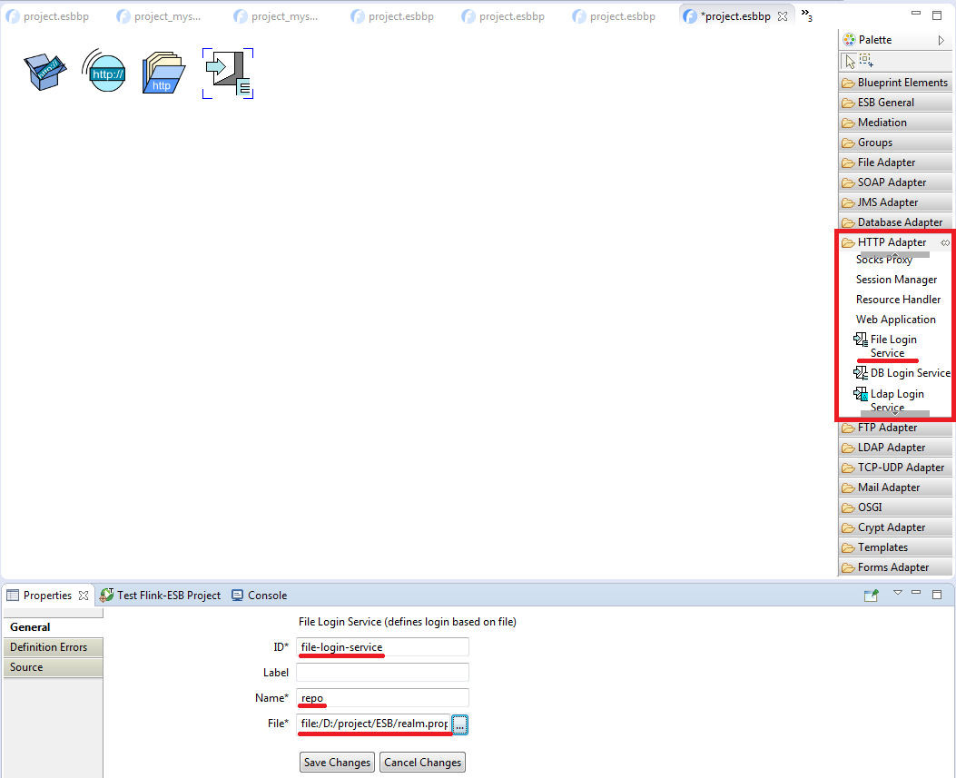 Click on "HTTP Adapter" palette drawer to expand it, and place a "File Login Service" component on editor canvas (scroll down within "HTTP Adapter" palette if you cannot see it). Enter properties as on picture below: