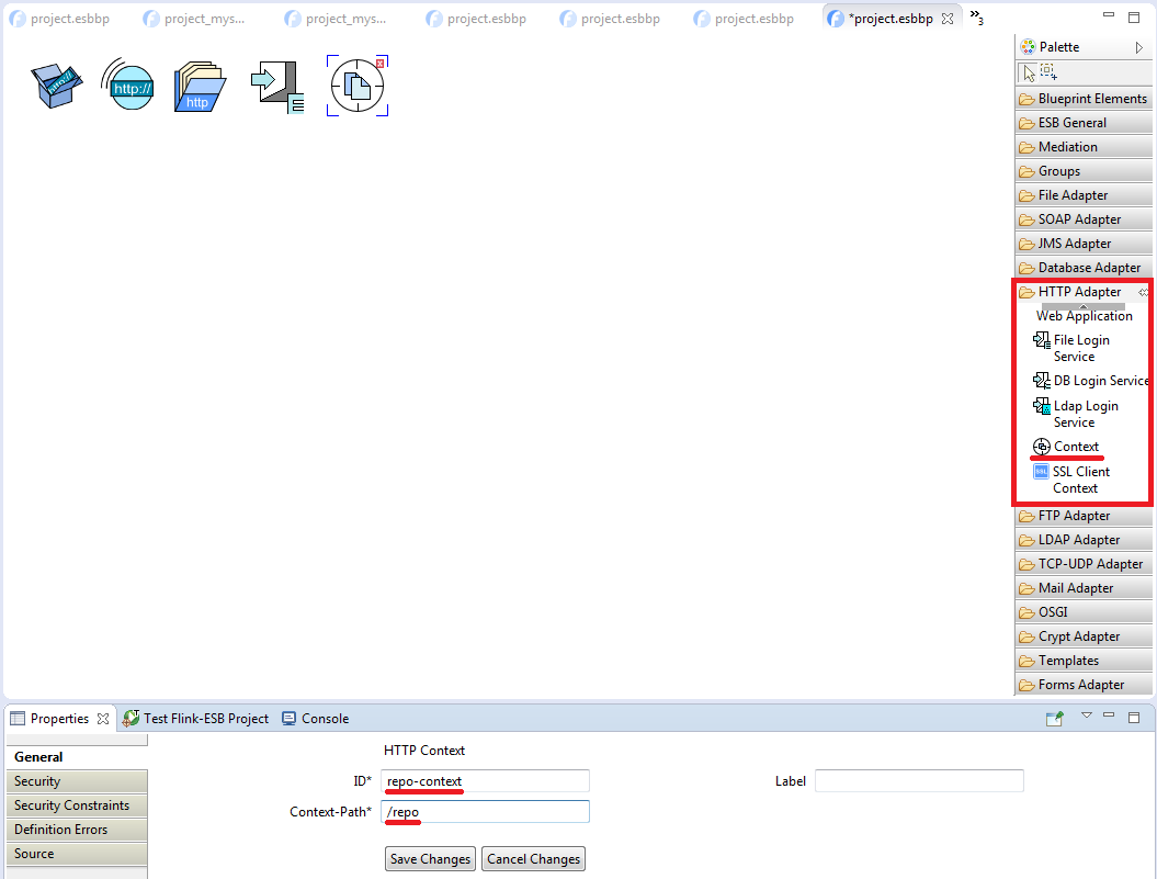 Add "Context" component from "HTTP Adapter" palette to the editor canvas. Set its properties as on picture below: