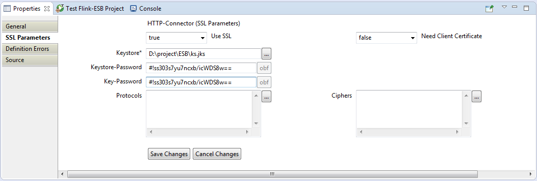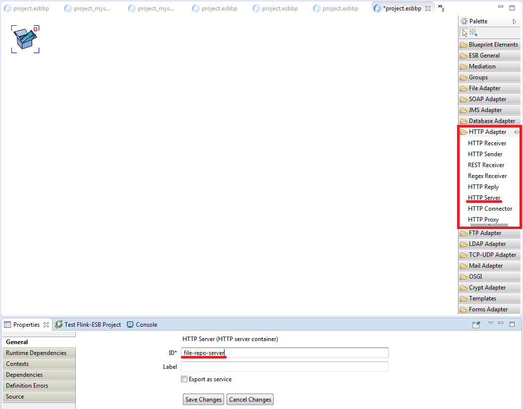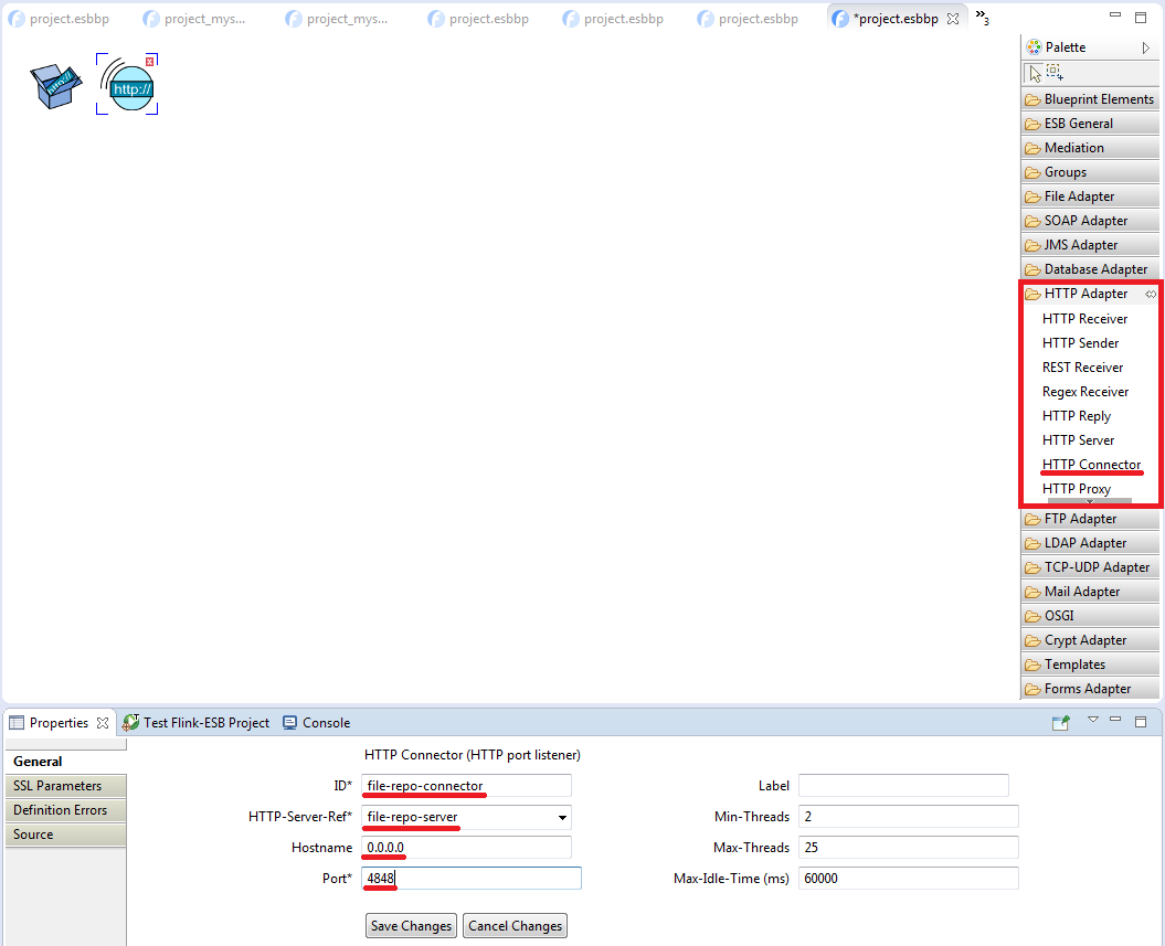 Click "Save Changes" to save Server's properties. Now select "HTTP Connector" within "HTTP Adapter" palette, and drop it onto editor canvas near "HTTP Server" component. Enter properties as on picture below:
