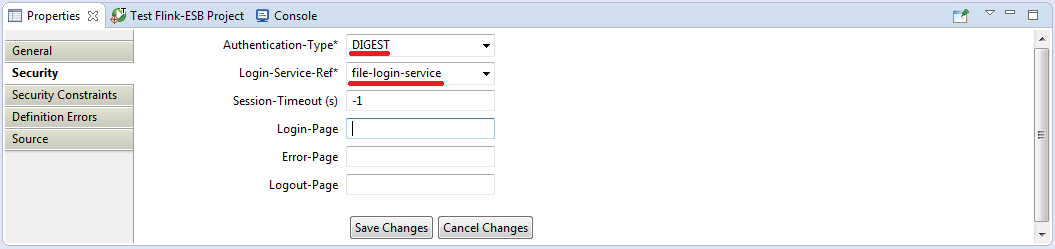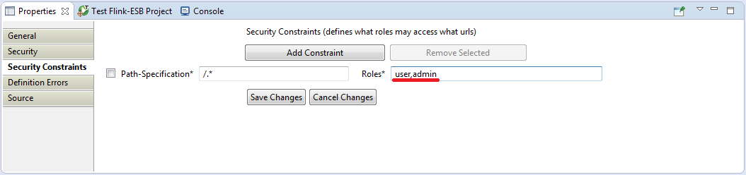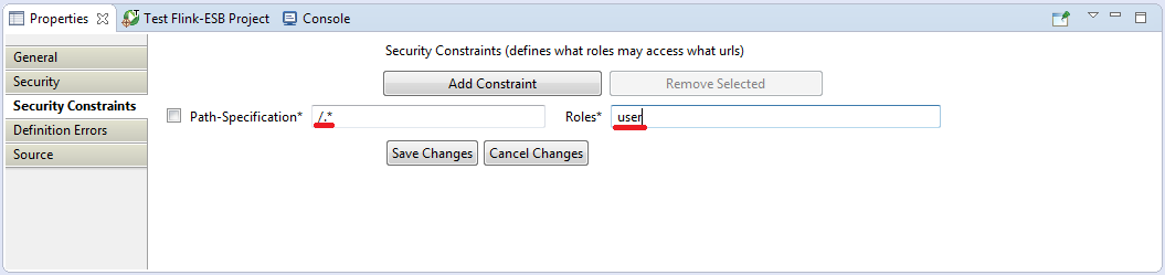 Select "Context" component in Flink-ESB Editor, click "Security Constraints" tab in the properties window and modify properties as on picture below: