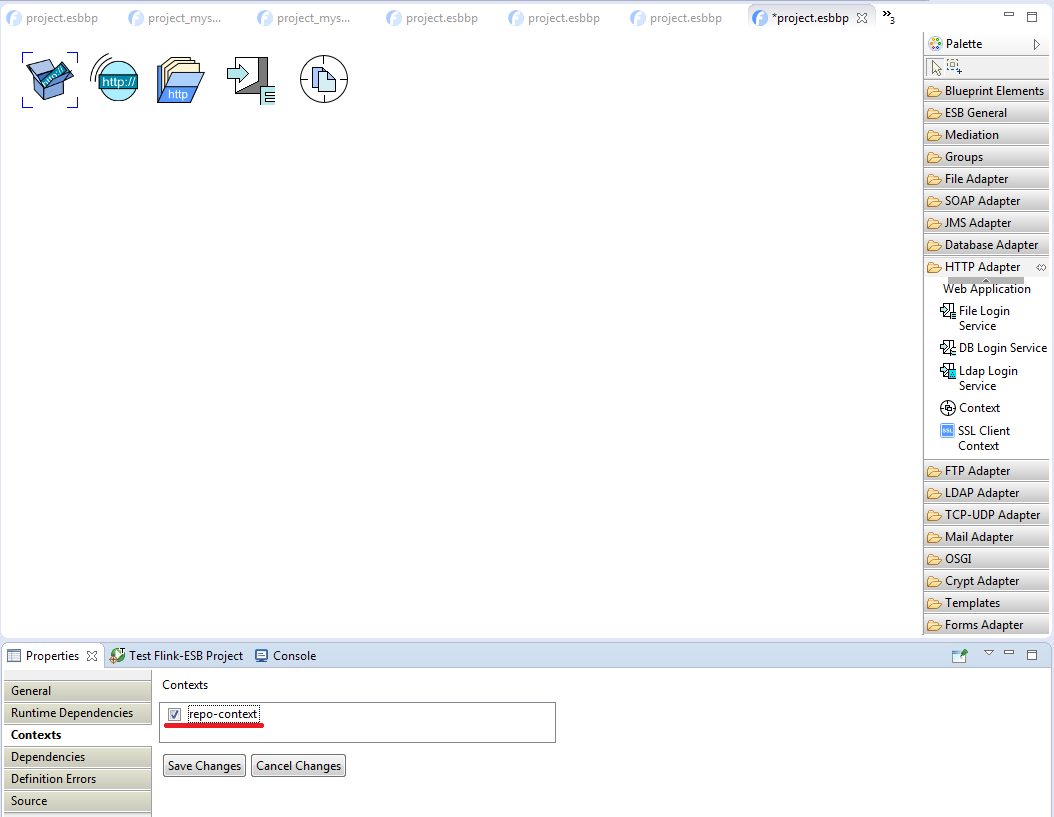 Click "Save Changes" to save Context's properties. Now select "HTTP Server" component in the editor and click on "Contexts" tab in the properties window. You should see one row with the context ID "repo-context". Select a checkbox beside that row: