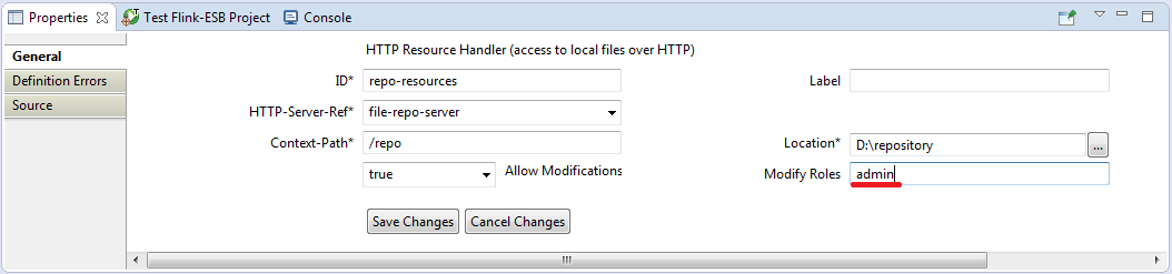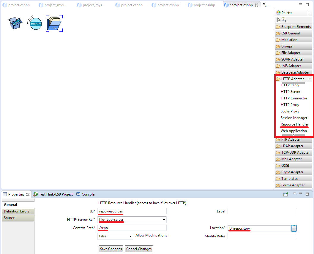 Select "Resource Handler" component in Flink-ESB Editor and adjust its properties as on picture below: