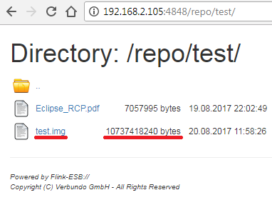 This way you can upload files of any size to the remote file repository. Flink-ESB processes data in stream mode, which means, it does not consume much RAM, even if the file is huge. The only limitation is file space available on your file repository server.