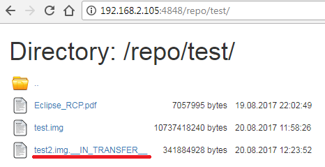 Transferring 10 GB of data to remote server can take a while. After curl command is completed check the content of "test" subfolder within file repositoty. It should look like on picture below: