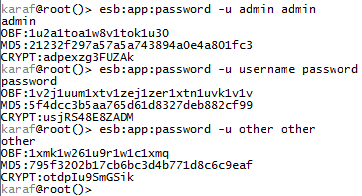 Flink-ESB provides command to encrypt/obfuscate/hash the password. Connect to SSH console of any Flink-ESB instance and run command: esb:app:password -u username password: