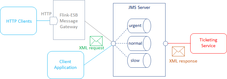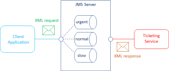 Original situation: there is a ticketing service, available over JMS transport on 3 different JMS queues: "urgent", "normal" and "slow"