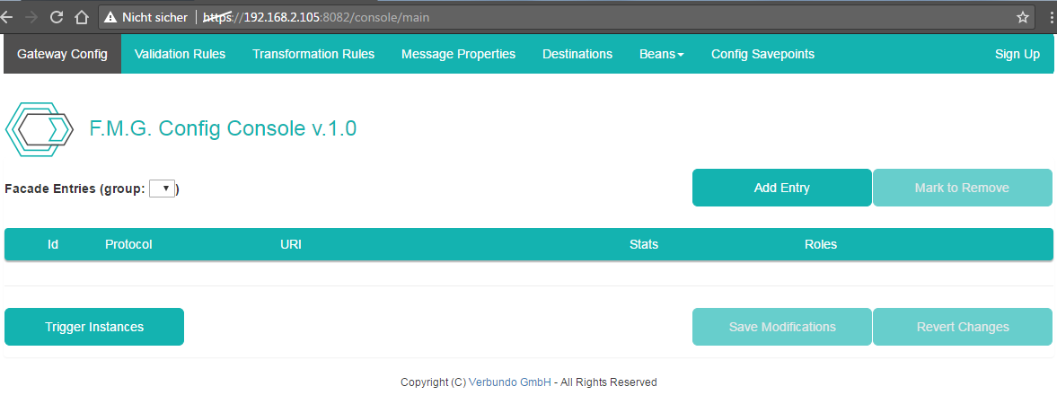 Open Flink-ESB Message Gateway Config Console in the browser. Default URL: https://localhost:8082. Login with default username/password: admin/admin. You should see now a main page with no config entries yet created as on picture below: