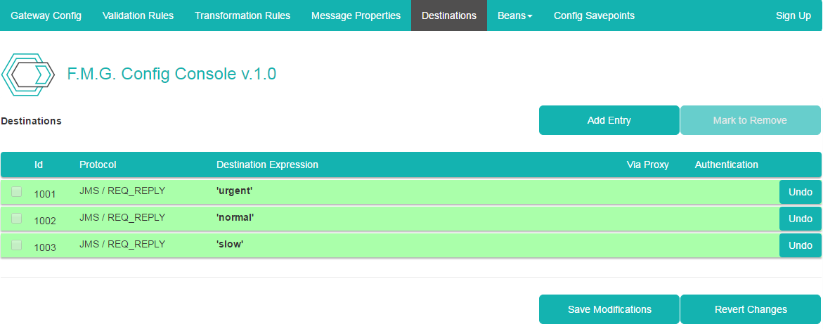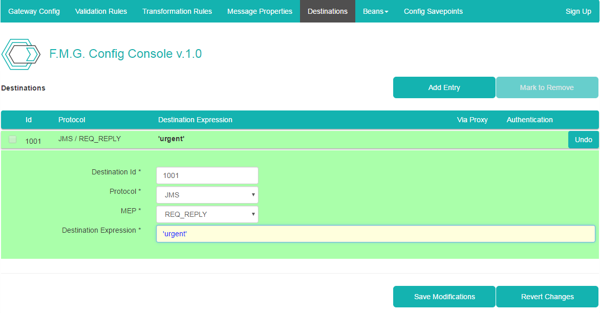 Click on added row to hide details panel. Click "Add Entry" button again and specify details for the second destination: "Destination Id" : 1002 (or any unique Id), "Protocol" : JMS, "MEP" : REQ_REPLY, "Destination Expression" : 'normal'.
