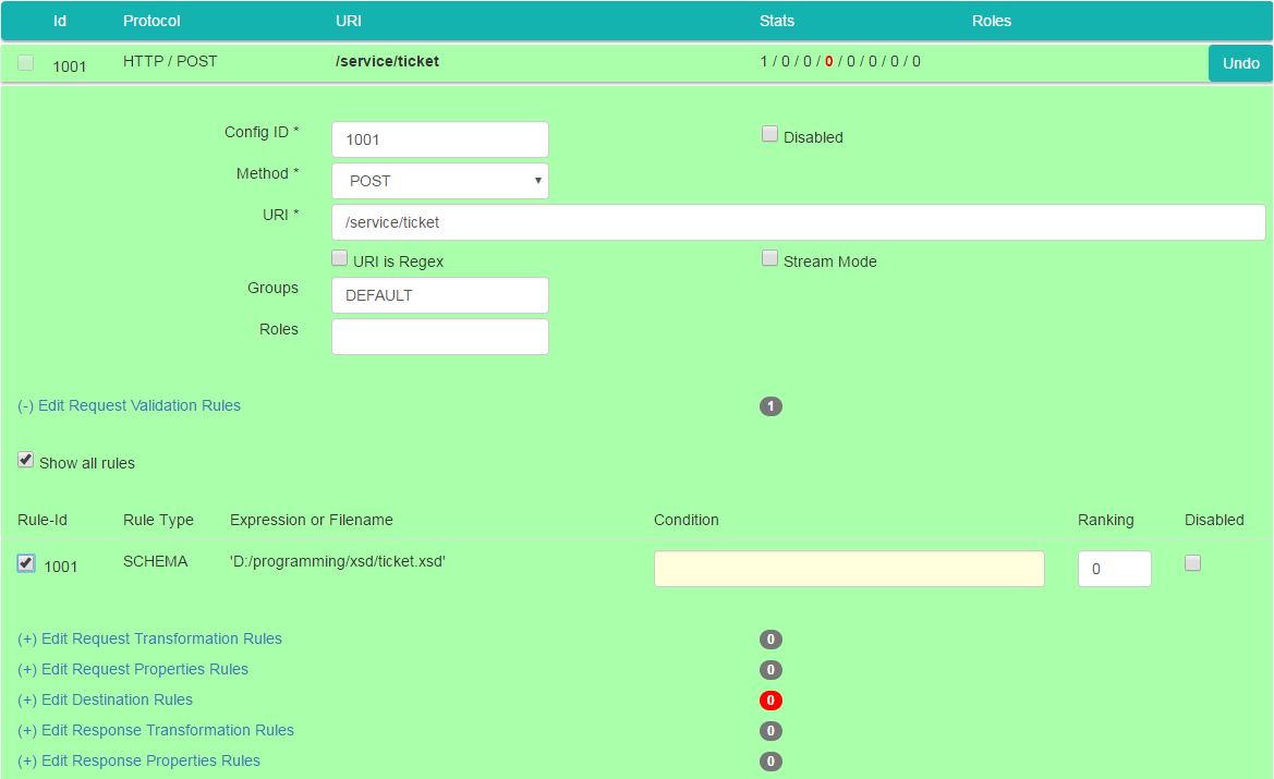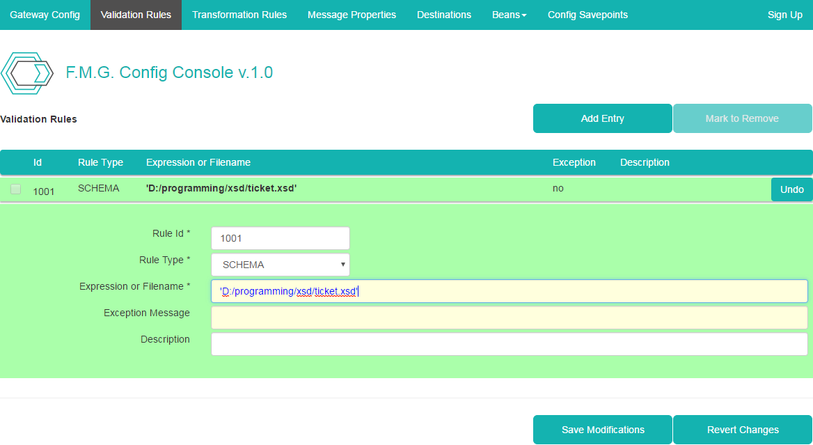 Click on "Validation Rules" tab and click "Add Entry" button. Type data as on picture below: "Rule Id" : 1001 (or any unique Id), "Rule Type" : SCHEMA, "Expression or Filename" : 'D:/programming/xsd/ticket.xsd' (use your local path to the schema file)