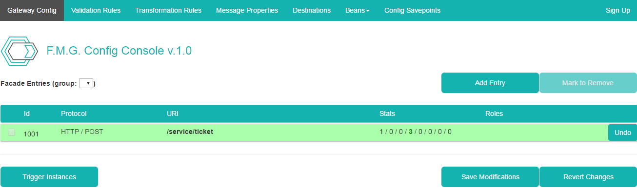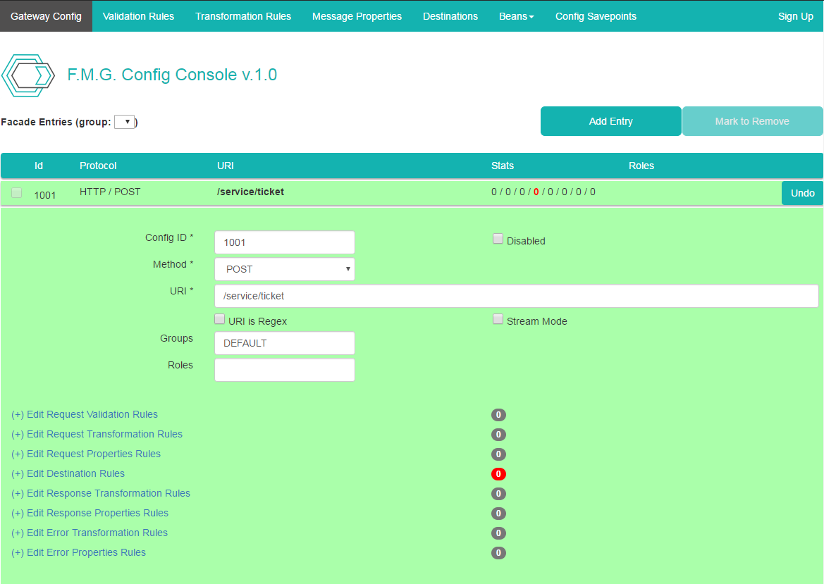 Click on "Gateway Config" tab and click "Add Entry" button. Type data as on picture below: "Config Id" : 1001 (or any unique Id), "Method" : POST, " URI" : /service/ticket. Leave all other fields as they are.